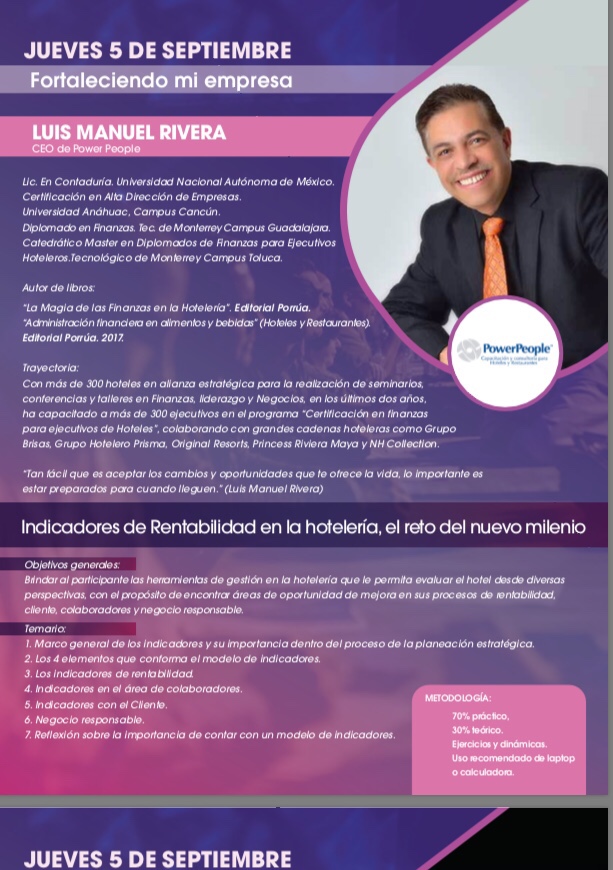 El día jueves 5 de septiembre estaré impartiendo el taller «indicadores de rentabilidad en la hotelería, el reto del nuevo milenio». A las 3.30 pm con una duración de 2 horas y 30 minutos.