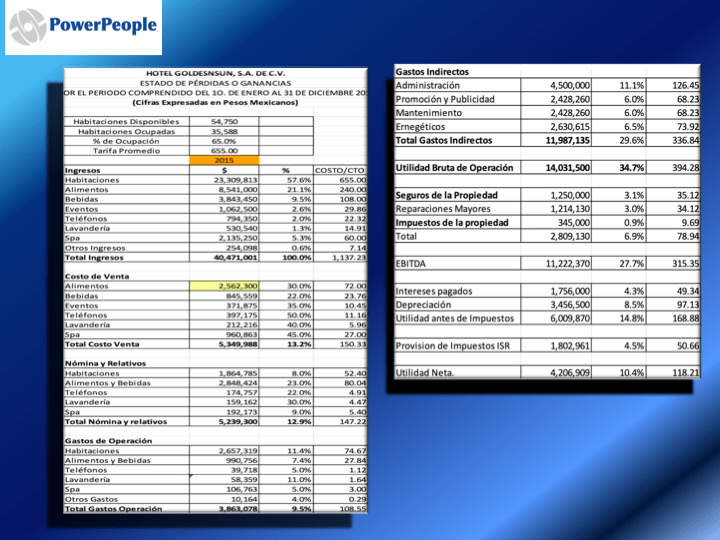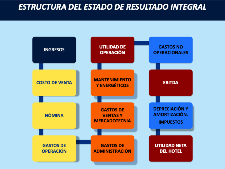 Antes de mostrarles la forma de obtener este indicador, deseo recomendarles que tengan clara la estructura del estado de resultado integral HOTELERO, ya que si deseas compararte con la hotelería es conveniente utilizar los formatos y metodología para mejor evaluación. A veces se desea calcular este indicador y en el mismo se encuentran conceptos que no son parte (depreciaciones, gastos de propietaria, impuestos y otros).