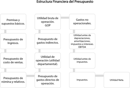 Conviene aclarar que en cada departamento de un hotel deben ser presupuestados los ingresos (en los casos que corresponda, como división cuartos, alimentos y bebidas y otros centros de negocio), el costo de venta, la nómina y relativos, los gastos directos de operación y obtener la utilidad departamental esperada, considerando además los gastos indirectos como: administración, ventas y mercadotecnia, mantenimiento y energéticos para llegar a la utilidad bruta de operación; los gastos no operacionales como: seguros de la propiedad; gastos mayores como: reparaciones o mejoras, honorario incentivo, gastos y productos financieros, renta (si la hay), intereses por deuda, impuestos y finalmente la utilidad antes de impuestos.