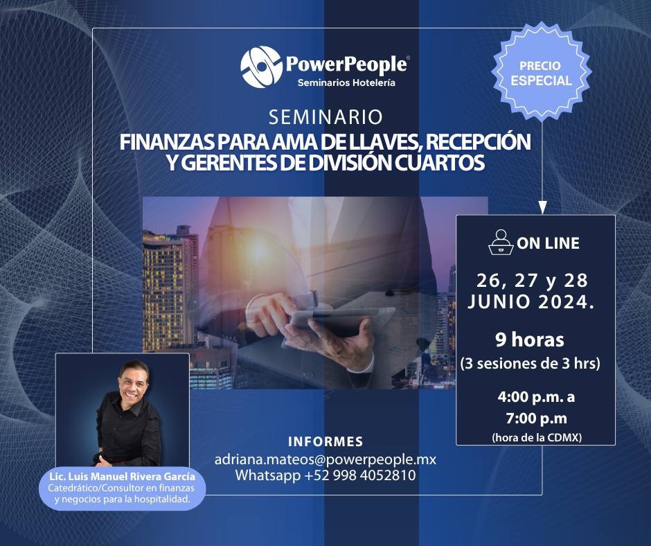 21 junio, 2024 LUIS MANUEL RIVERA Seminario FINANZAS DIVISIÓN CUARTOS HOTEL Con gusto te compartimos nuestro próximo evento en línea para toda America latina. Informes: Adriana.mateos@powerpeople.mx http://www.PowerPeople.mx Finanzas División cuartos Finanzas hoteleras PowerPeople Certificación final a Los Cabos Las 5 claves del éxito de un hotel. Puedes compartirlo en: Compartir en X (Se abre en una ventana nueva) X Comparte en Facebook (Se abre en una ventana nueva) Facebook Compartir en WhatsApp (Se abre en una ventana nueva) WhatsApp Compartir en LinkedIn (Se abre en una ventana nueva) LinkedIn Compartir en Threads (Se abre en una ventana nueva) Threads Me gusta Cargando... Relacionado