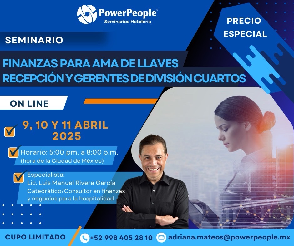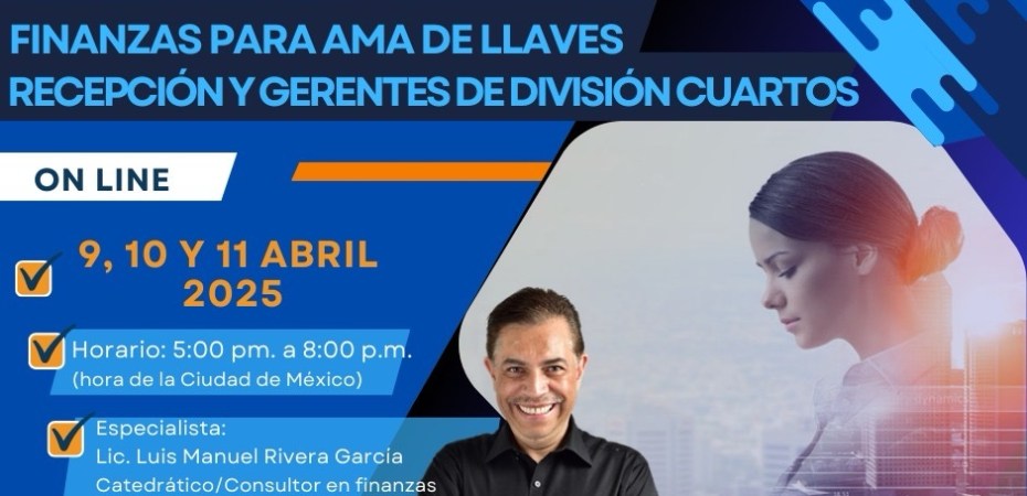 SeminarioFINANZAS PARA AMA DE LLAVES, RECEPCIÓN Y GERENTES DE DIVISIÓN CUARTOSModalidad: EN LÍNEA