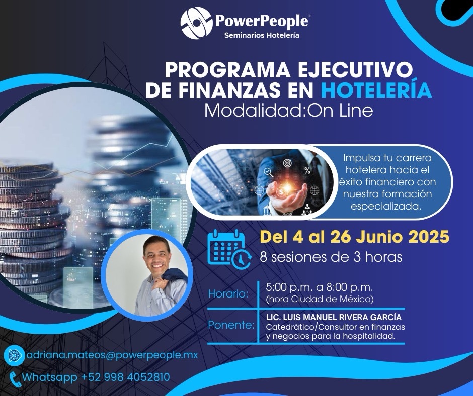 Gestión financiera hotelera (ingresos, costos, gastos) Presupuestos operativos y de inversión Análisis de estados financieros Evaluación de proyectos (ROI, TIR) Optimización del flujo de efectivo Contabilidad específica para hoteles (All Inclusive, Plan Europeo, Timeshare) Gestión de costos en alimentos y bebidas Toma de decisiones basada en KPIs hoteleros (ADR, RevPAR, GOPPAR)