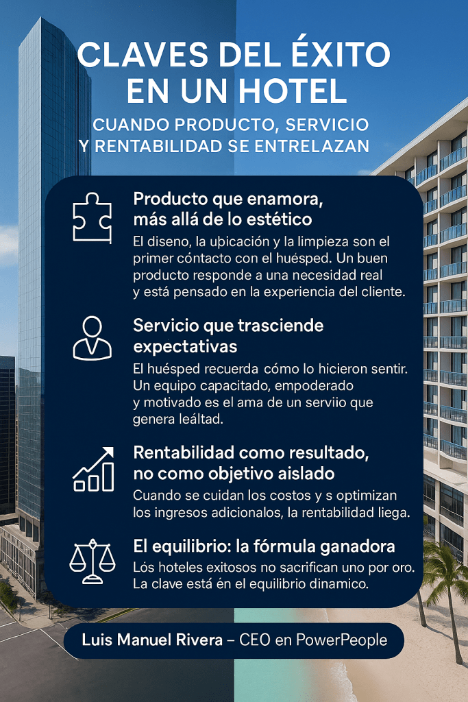 Los hoteles exitosos no sacrifican uno por otro. Un producto atractivo sin servicio pierde alma. Un gran servicio sin rentabilidad es insostenible. Rentabilidad sin experiencia no fideliza.