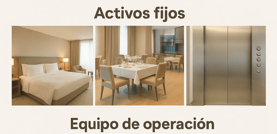 Inmuebles (edificio del hotel o restaurante) Mobiliario y equipo (camas, mesas, sillas) Equipos de cocina y lavandería industrial Aires acondicionados, elevadores Sistemas de seguridad o CCTV