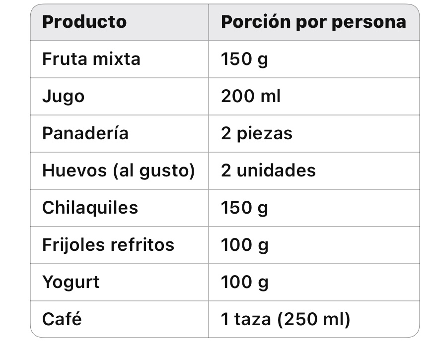 Frutas: papaya, melón, sandía Jugos: naranja, toronja Cereales: corn flakes, granola Panadería: pan dulce, pan blanco y de caja Platos calientes: huevos al gusto, chilaquiles, frijoles refritos Extras: yogurt, leche, café, té, mantequilla, mermelada