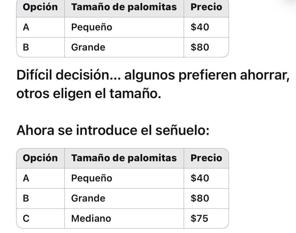 Cuando a un cliente se le presentan dos opciones (A y B), puede resultar difícil decidir. Pero si se introduce una tercera opción (C), que es claramente peor que una de las opciones (por ejemplo, peor que B pero parecida), la opción B se vuelve más atractiva en comparación, lo que aumenta su probabilidad de ser elegida.