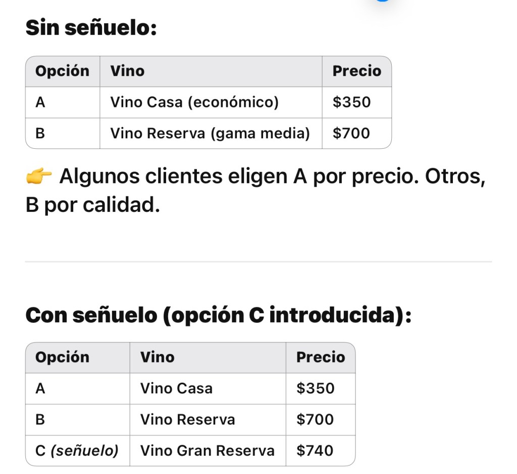 Ahora, el Vino Reserva (B) parece una mejor oferta comparado con el Gran Reserva (C), ya que por solo $40 más no se percibe una gran mejora en calidad o experiencia. Esto dispara las ventas del vino de $700, que era el objetivo del restaurante.