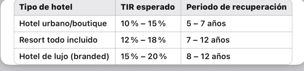 Para afinar estas métricas hacia tu proyecto específico (tipo de hotel, destino, capital propio vs deuda), sería ideal realizar un flujo de caja proyectado y calcular la TIR y el payback con tus números.