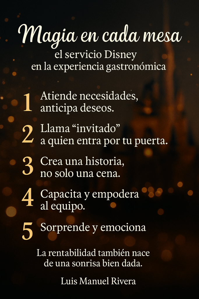 “Lo que Disneyland hace en sus parques vale millones de dólares, pero muchas de sus técnicas pueden aplicarse (y generan ROI) en restaurantes cotidianos: crear magia con cada plato, con cada saludo, con cada momento inesperado.”