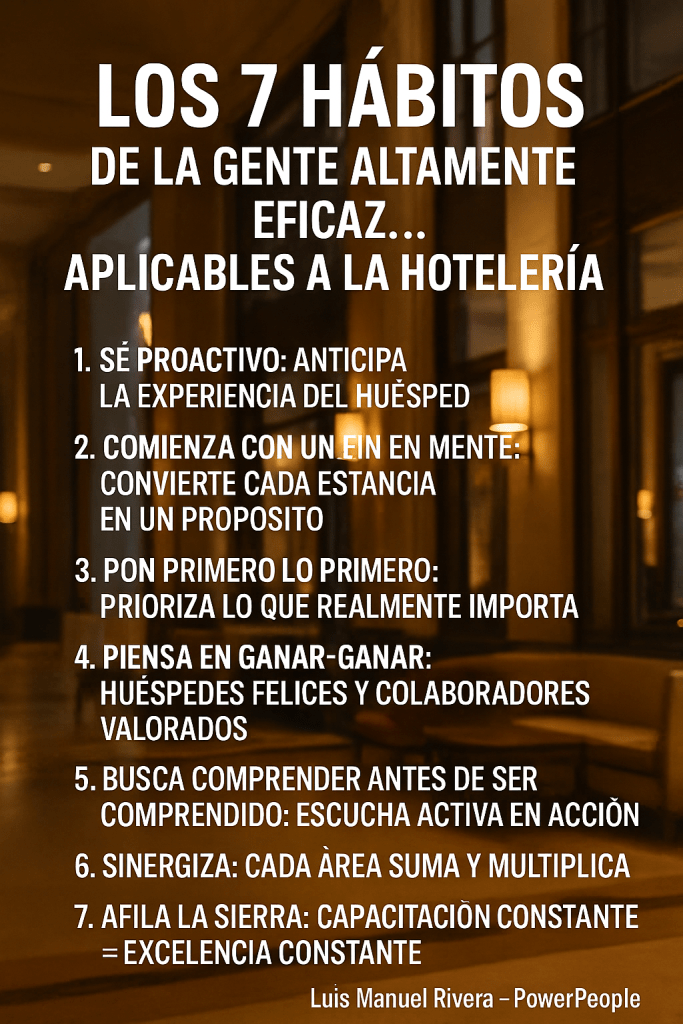 Un artículo poderoso, claro y aplicable a la realidad hotelera actual, inspirado en Los 7 Hábitos de la Gente Altamente Eficaz de Stephen R. Covey, pero adaptado al ADN de la hotelería moderna y que vale compartir.