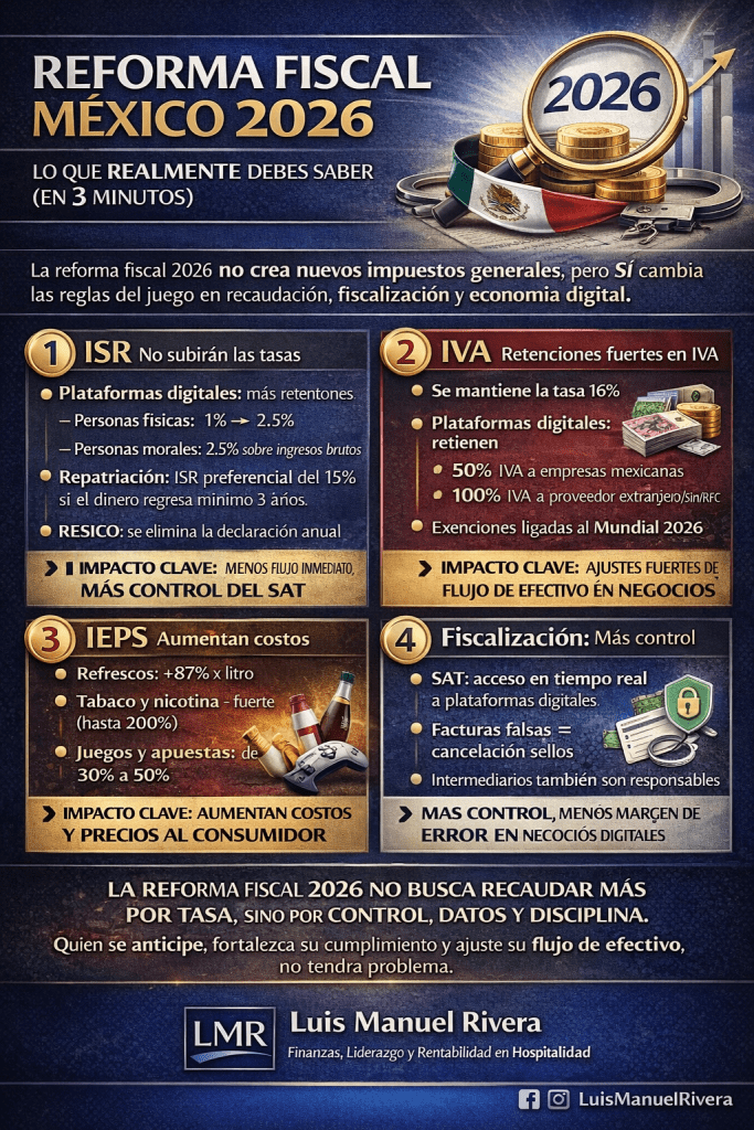 No nuevos impuestos, pero más retenciones y más control. Hoteles y restaurantes: Impacto por IEPS en refrescos, alcohol, tabaco. Retenciones de IVA si venden vía plataformas. Condonación del 100% de multas y recargos si se paga el impuesto principal antes de que termine 2026.