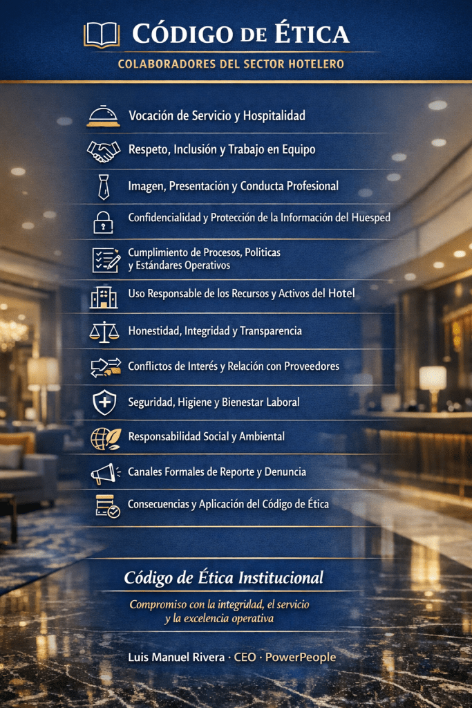 Cuando la ética no se considera desde el inicio, se generan desajustes culturales, rotación y riesgos operativos que impactan directamente en el servicio y en la confianza del huésped. Por ello, el Código de Ética debe ser un criterio clave de selección, no un documento posterior.