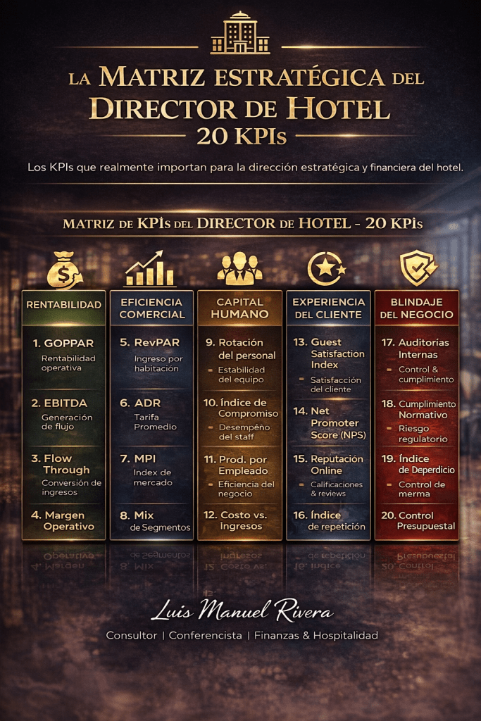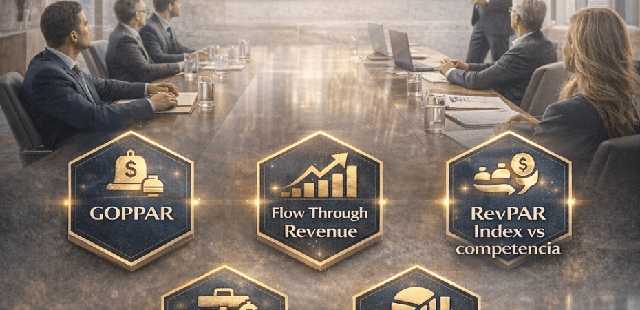 GOPPAR Flow Through Revenue Costo de adquisición por canal Mix de mercado rentable RevPAR Index vs competencia