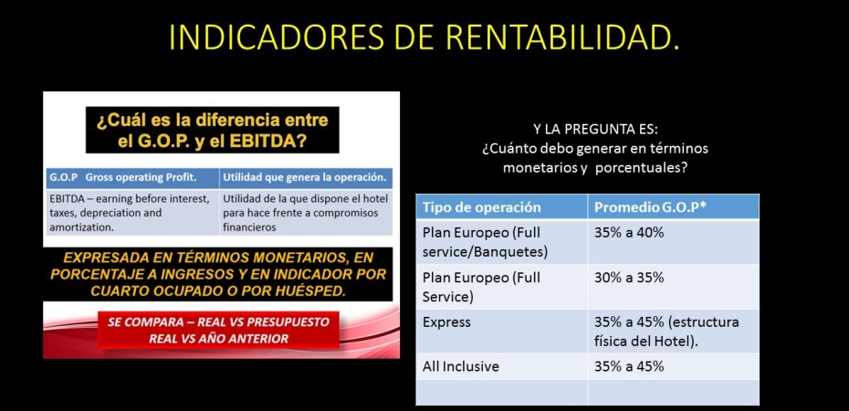 EBITDA.- Earnings before interest, taxes, depreciation and amortization y en español, utilidad antes de impuestos, intereses, depreciaciones y amortizaciones. Este indicador mide la rentabilidad del hotel para hacer frente a sus compromisos con bancos, tanto en capital como intereses. Hay que tomar en cuenta que entre el GOP y el EBITDA podemos encontrar honorarios corporativos, honorarios por franquicia, gastos de la propiedad como seguros, predial, principalmente. Eventualmente los conceptos arriba mencionados podrán incluirse en el caso de un contrato de operación de común acuerdo, antes o después del GOP. Espero haber podido ejemplificar la diferencia entre estos dos conceptos. Contacto: Luis Manuel Rivera luis.rivera@powerpeople.mx